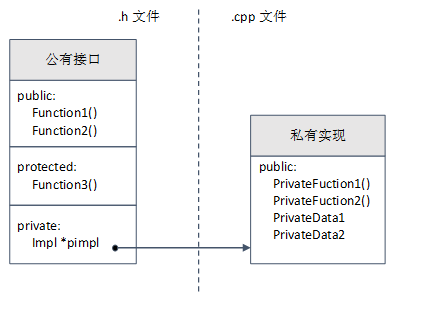 图 1: Pimpl 惯用法:这里的公有类拥有一个私有指针,该指针指向隐藏的实现类