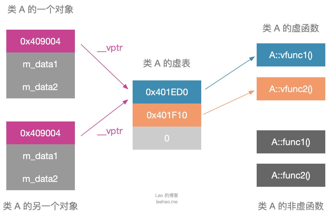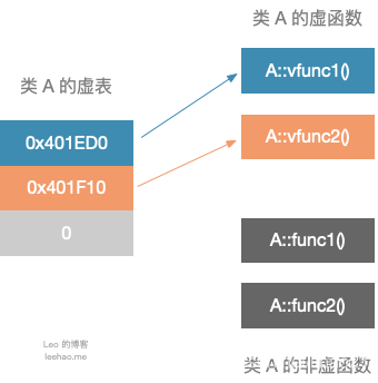 类 A 包括两个虚函数,故 A vtbl 包含两个指针,分别指向A::vfunc1()和A::vfunc2()。
